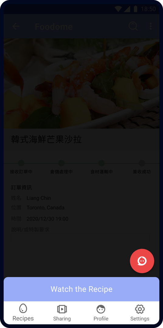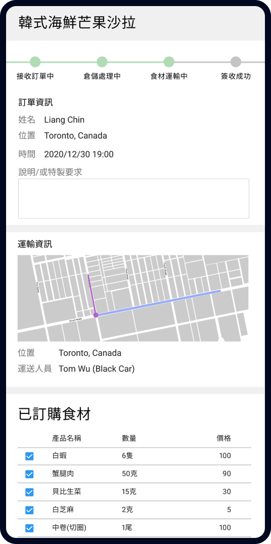 在運送詳情頁的時候,除了會附上你所購買的食材明細之外,還會有即時路況讓你看看你現在的食材運輸到那裡,以方便使用者進行規劃。