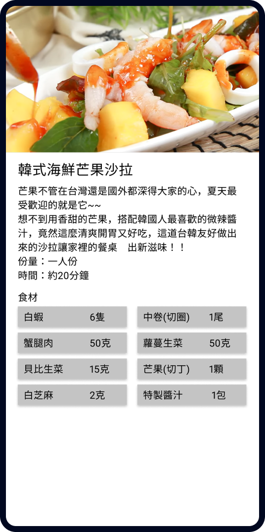 在商品詳細頁的時候,除了會提供普通的商品說明,還會提供產品圖增加購買慾,並且在底下一方塊來提供所用到的食材,方便讓消費者了解說會購買到哪些食材。