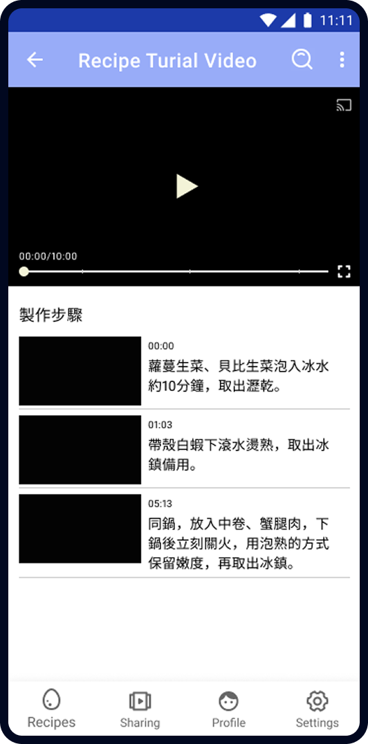 在食材影片教學的影片下方,會提供快速大綱以供選擇,只要點選文字就會自動的將影片跳轉到文字所標註的時間點,讓使用者可以快速依照文字找到所需要的部分進行觀看。